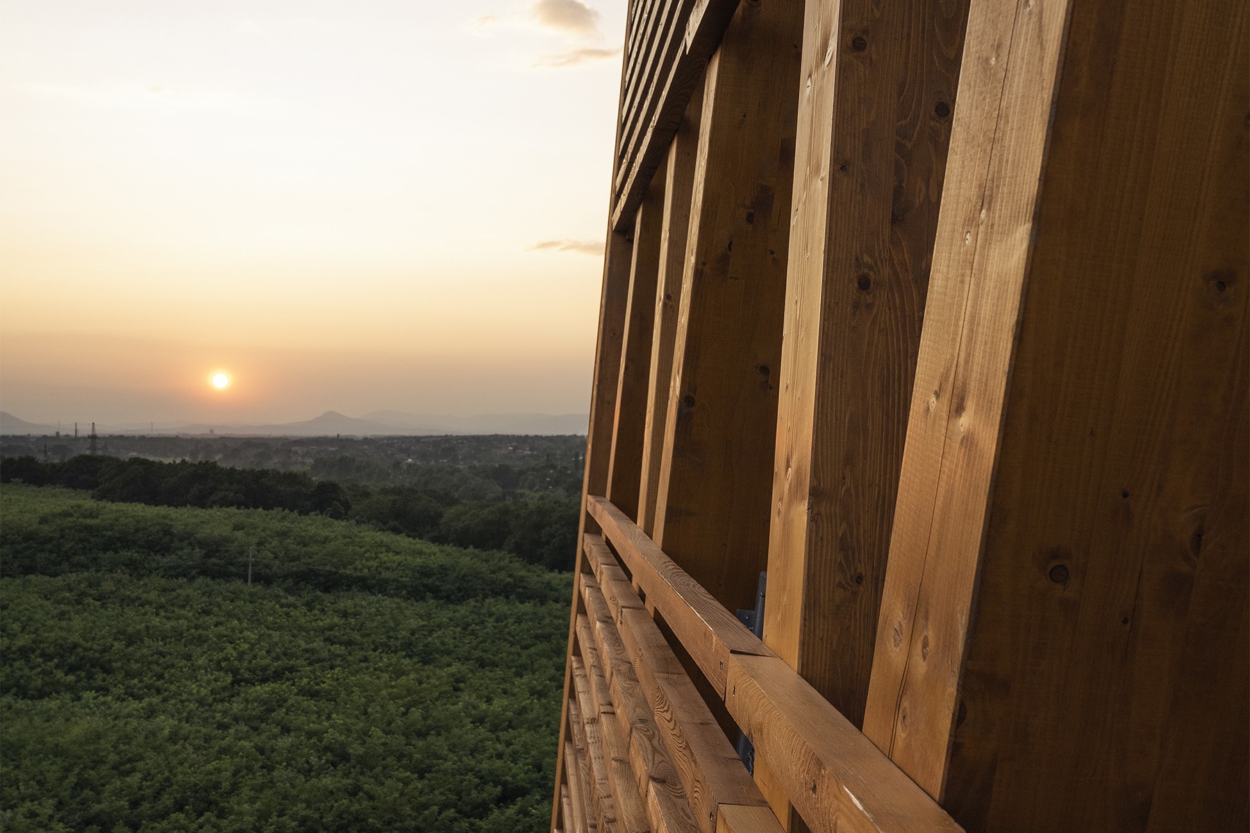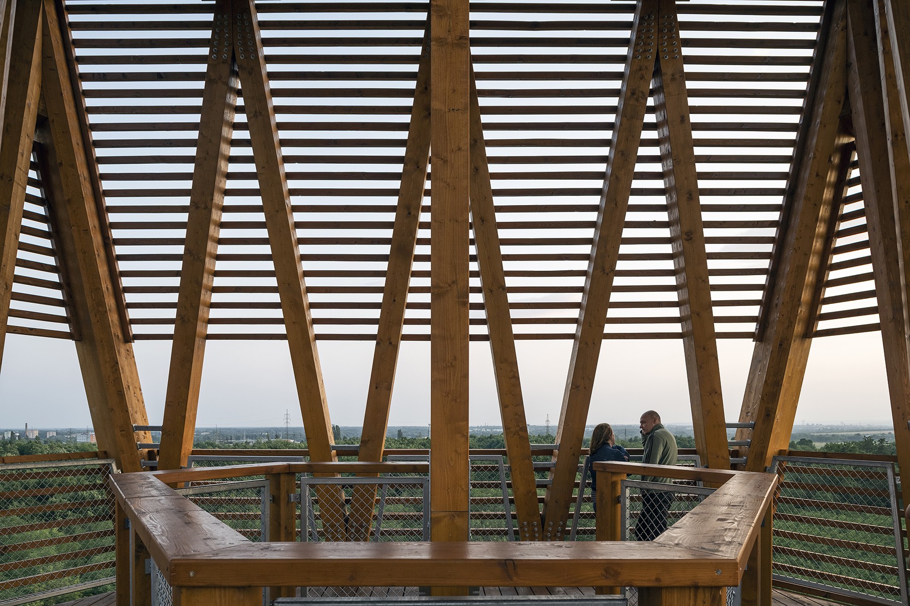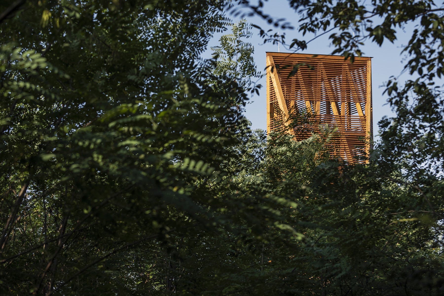 The timber-framed tower, designed on a reinforced concrete base, is a modern building structure, a sign visible from afar, but also a spiritual link between earth and sky, connecting man with nature, offering contemplation and tranquillity.