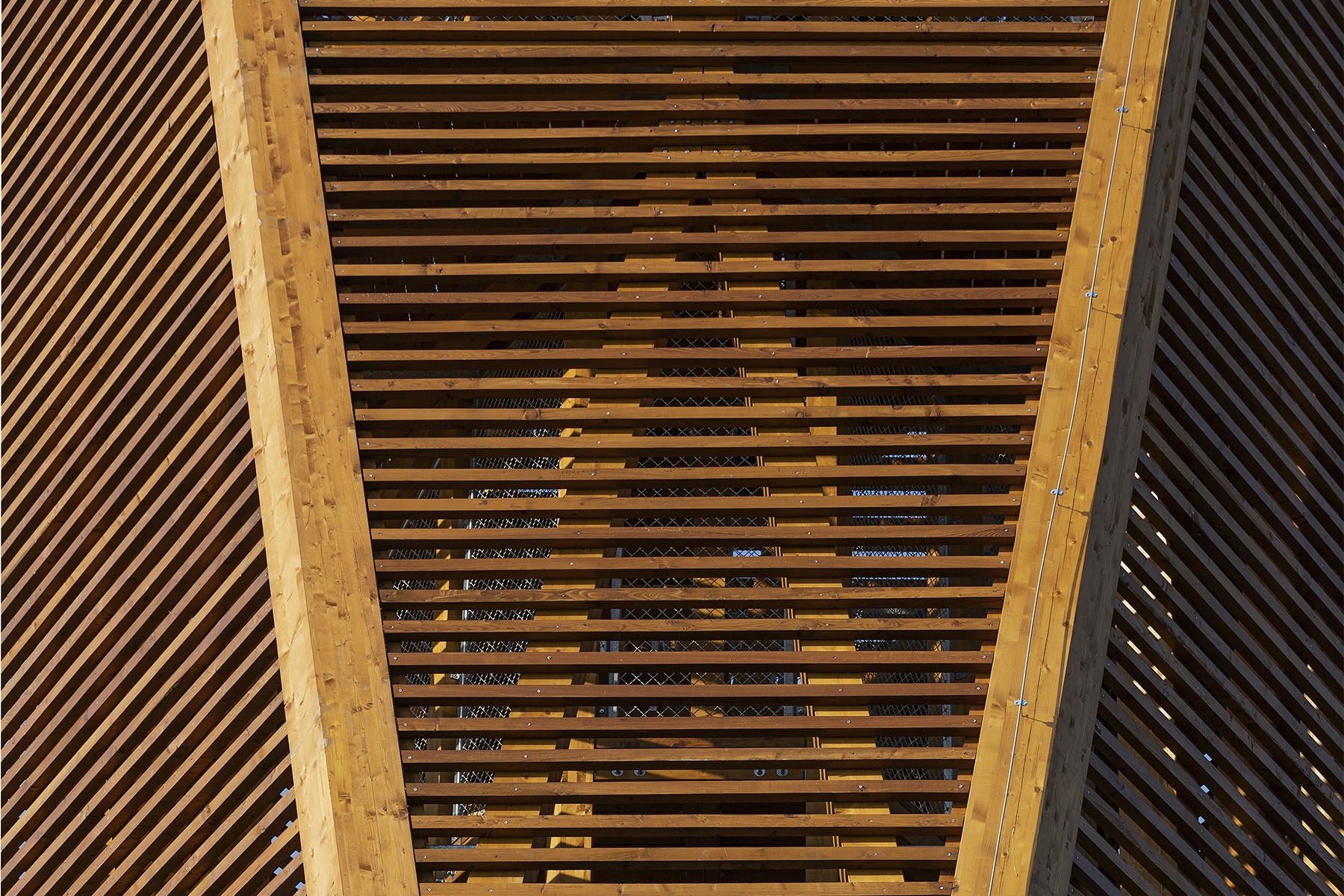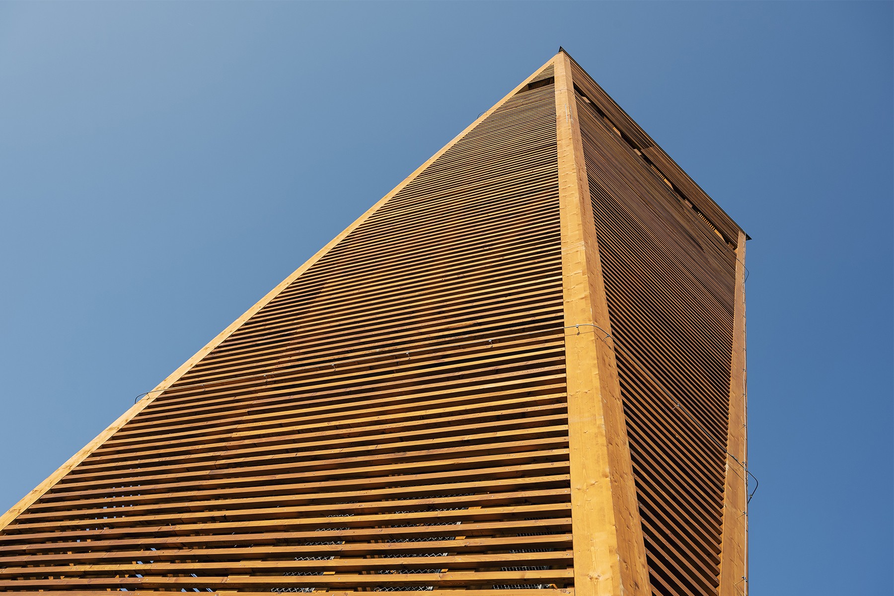 An interesting feature of the tower is its mass: a 'column' built on an equilateral triangular plan, which is both unusual and regular. The 27-metre-high top is a triangle corresponding to the ground plan of the lower level but rotated by 60 degrees. The two horizontal planes are connected by triangular front walls sloping gently inwards and outwards. The edges are formed by wooden beams coming from the summits.