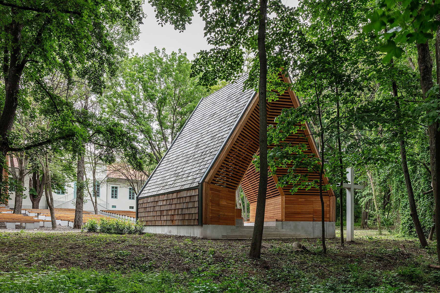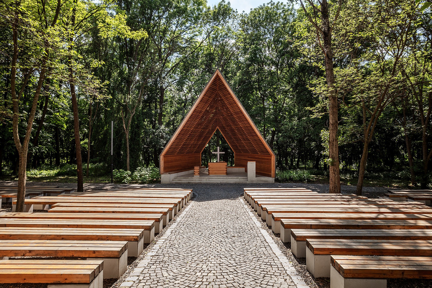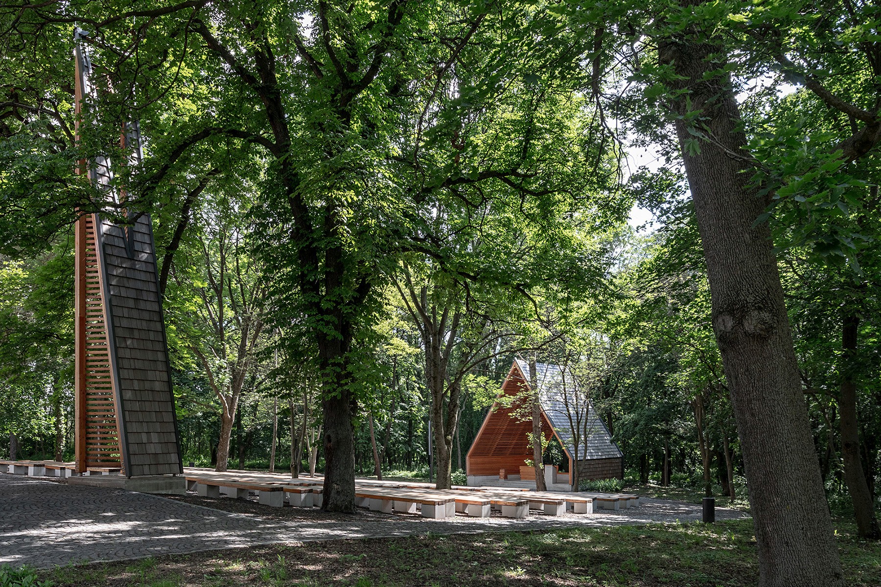 The appearance of the Blessed Virgin in Fatima was first celebrated on May 13th in 1951 in Alsószentiván. This tiny village has been frequented by lots of pilgrims since then, the Catholic church being a shrine on the 13th of every month between May and October. The renovation of the existing building and the shrine is a celebration of the 100th anniversary of Fatima. The open-air place for masses is made of timber, whilst the new altarpiece of the church was made from the plinth of a monument of the Soviet era. Szluha Castle, which also contains the parish, features an elegant portico, as well as a similarly stylish staircase from the garden and the renewed architectonic frame. The castle itself has a representative entrance, the axis of which is lengthened towards the garden with a pavilion. Among the foliages of the chestnut trees, there is also a geometric belfry, made exclusively of wood. The place for masses has an open-air pavilion with a shingle roof designed after the sanctuary widespread after the 2nd Vatican Council. The rebirth of the pilgrims’ centre evolved to its entirety with the reconfiguration and revival of the garden and the mansion grounds.