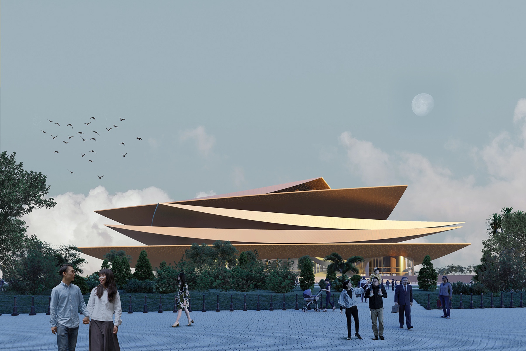 The appearance of the Opera House shall be inspiring and passionate. The lasting experience of the view is provided by the large, curved roof elements. The unique structures are accessible as roof terraces in several places, and they also function as an observation deck from the higher floors. The dominant color of the building is golden yellow. The Opera House is an open and receptive public building. It is both a cultural stronghold and a home of everyday life, which, in addition to its diverse range of programs, also serves the recreational needs of the local people. At the same time, due to its scale and appearance, it will also be the number one destination of domestic and international tourism.