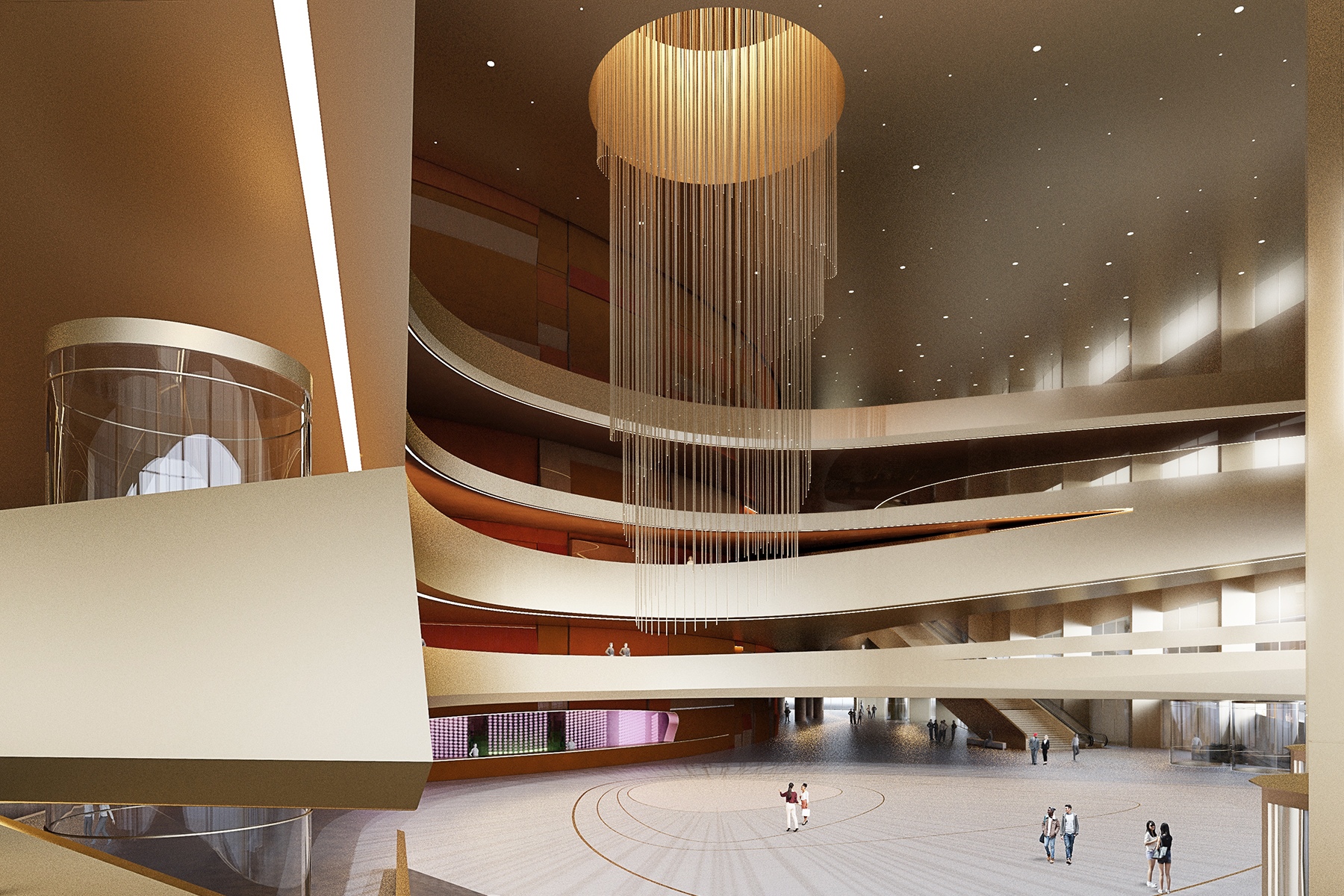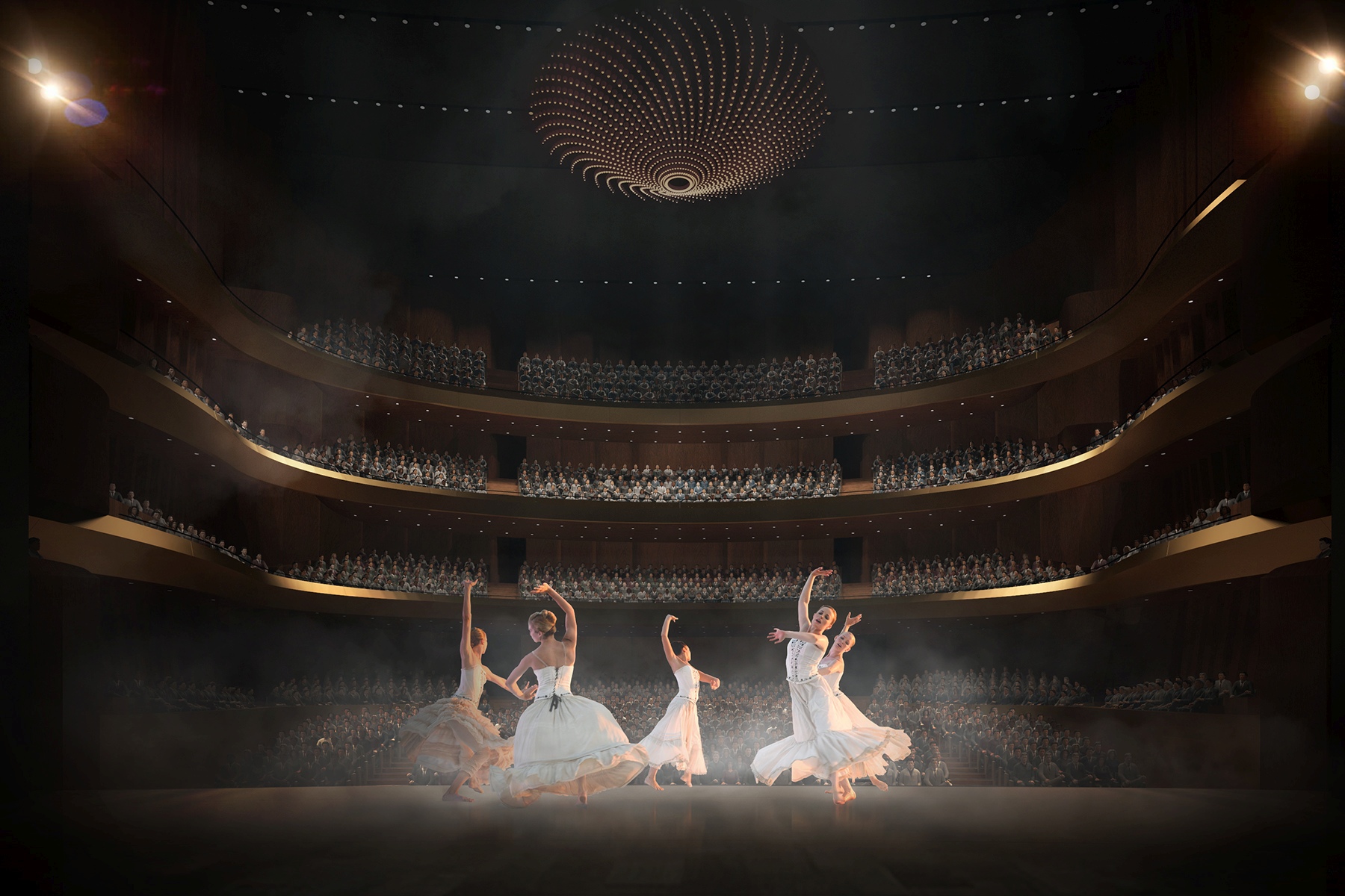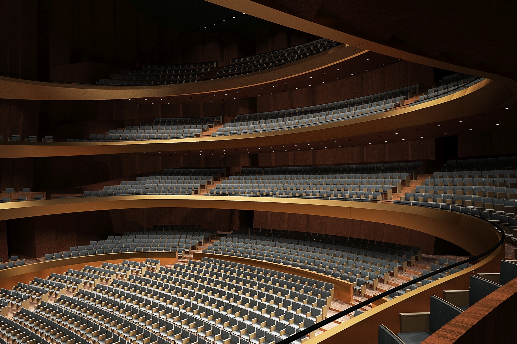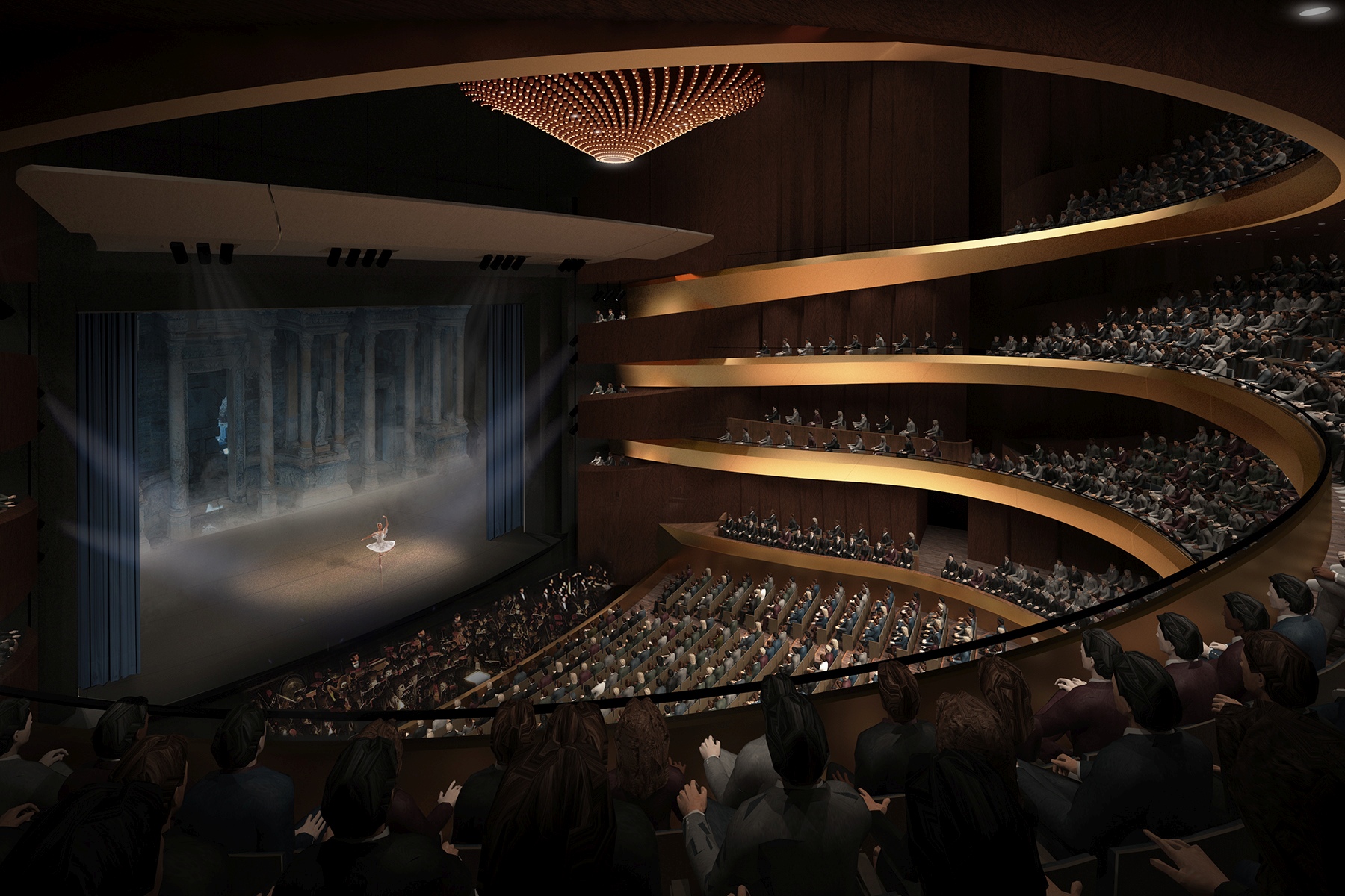 The opera hall has 2300 seats, with shape and volume designed in consideration of the sightline, the acoustic design, and pleasant visual experiences. We designed a unique balcony system. The proposed design of the main auditorium is based on the “horseshoe” shaped Italian Baroque Opera concept, which minimizes physical distance between performers and audience, gives optimal intimacy and clarity. Our novelty of the balconies provides closer seats to the stage with better sightlines. The innovation helps to avoid deep balconies and back seats with dry sound. In many horseshoe shaped halls with several levels of balconies, it is impossible to provide rich reverberant sound for the rear seat rows under the balconies. In our concept, this challenge is overcome by detaching the balconies from the surrounding walls whereby the reverberance can drizzle down from behind to the remote seat rows and provide a high sense of acoustic envelopment.